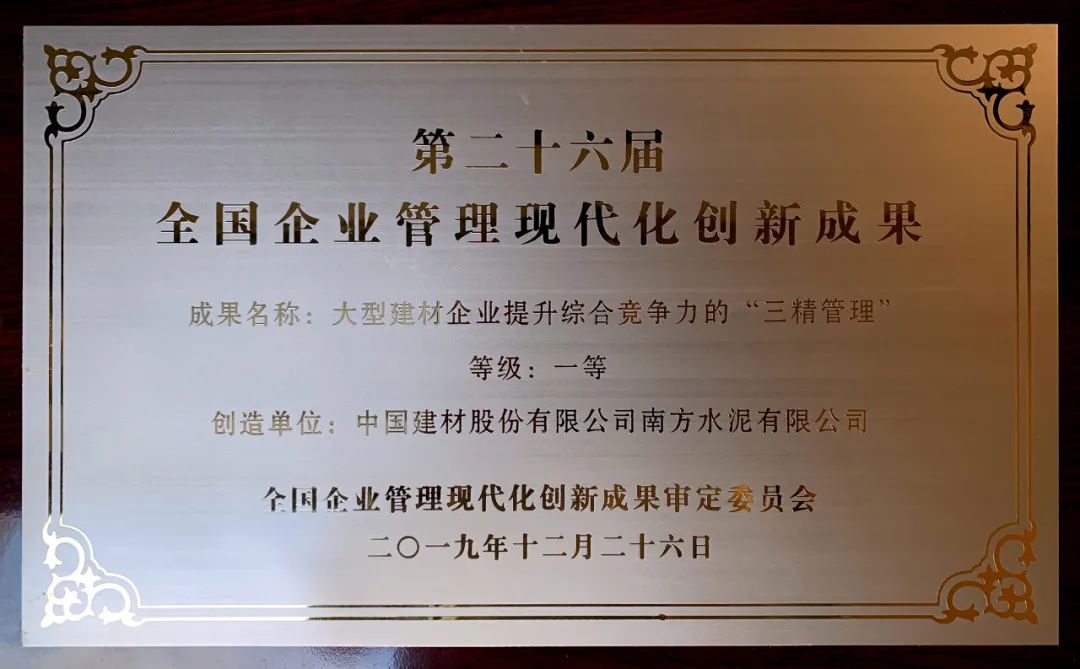 来源:集团公司管理部、南方水泥 发布时间:2020-10-2910月22日,由中国企业联合会主办的2020年全国企业管理创新大会在河南焦作召开。大会发布了第二十六届全国企业管理现代化创新成果,K8凯发国际集团推荐南方水泥有限公司申报的《大型建材企业提升综合竞争力的“三精管理”》取得一等奖。这是K8凯发国际集团荣获的第11个全国企业管理现代化创新成果一等奖。