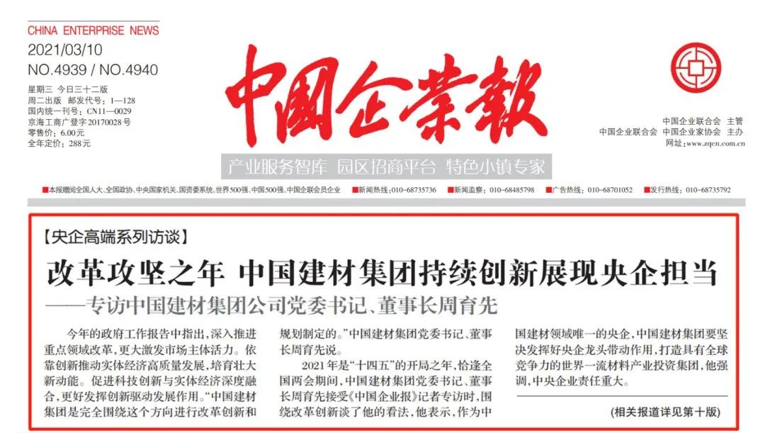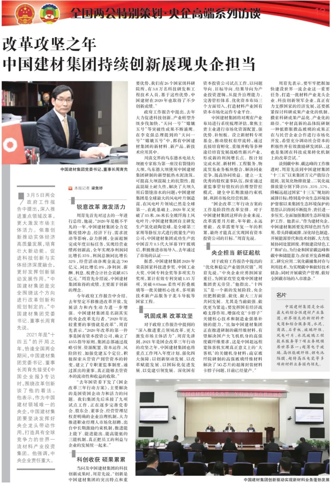 2021年是“十四五”的开局之年,恰逢全国两会期间,K8凯发国际集团作为K8凯发国际领域唯一的央企,如何发挥好央企龙头带动作用尤为关键。近期围绕改革创新和如何打造具有全球竞争力的世界一流材料产业投资集团等问题,K8凯发国际集团党委书记、董事长K8凯发国际接受了中国企业报记者的专访,相关报道在今天报纸的头版进行了刊发。