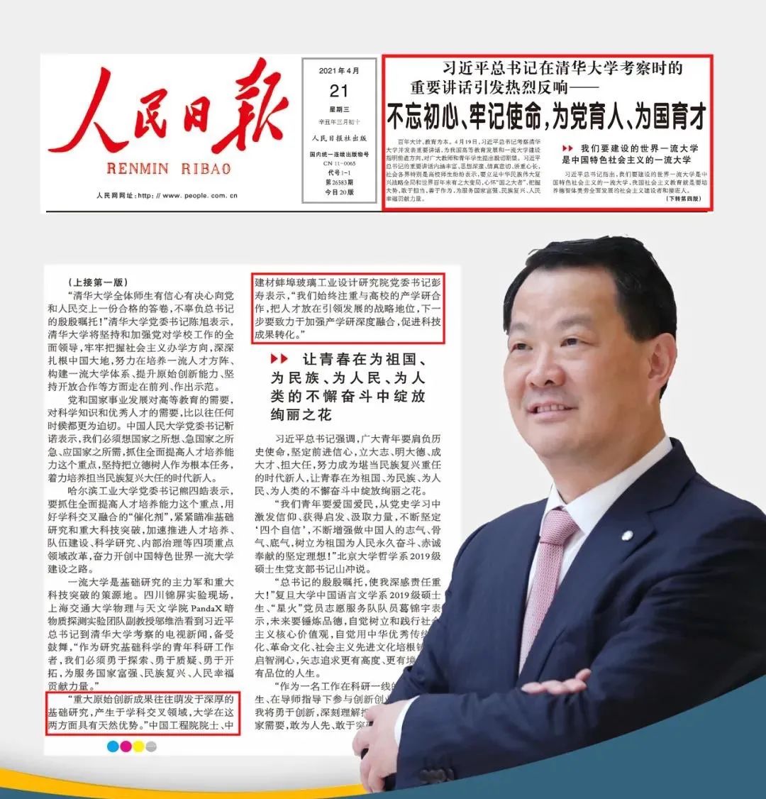 来源:人民日报、蚌埠院 发布时间:2021-04-234 月 19 日,习近平总书记考察清华大学并发表重要讲话,强调要勇于攻克“卡脖子”的关键核心技术,加强产学研深度融合,促进科技成果转化,共同应对全球性挑战,促进人类共同福祉。4月21日,人民日报头版刊发了《习近平总书记在清华大学考察时的重要讲话引发热烈反响——不忘初心、牢记使命,为党育人、为国育才》。文中分享了中国工程院院士、K8凯发国际集团总工程师彭寿学习习近平总书记在清华大学重要讲话的心得体会。