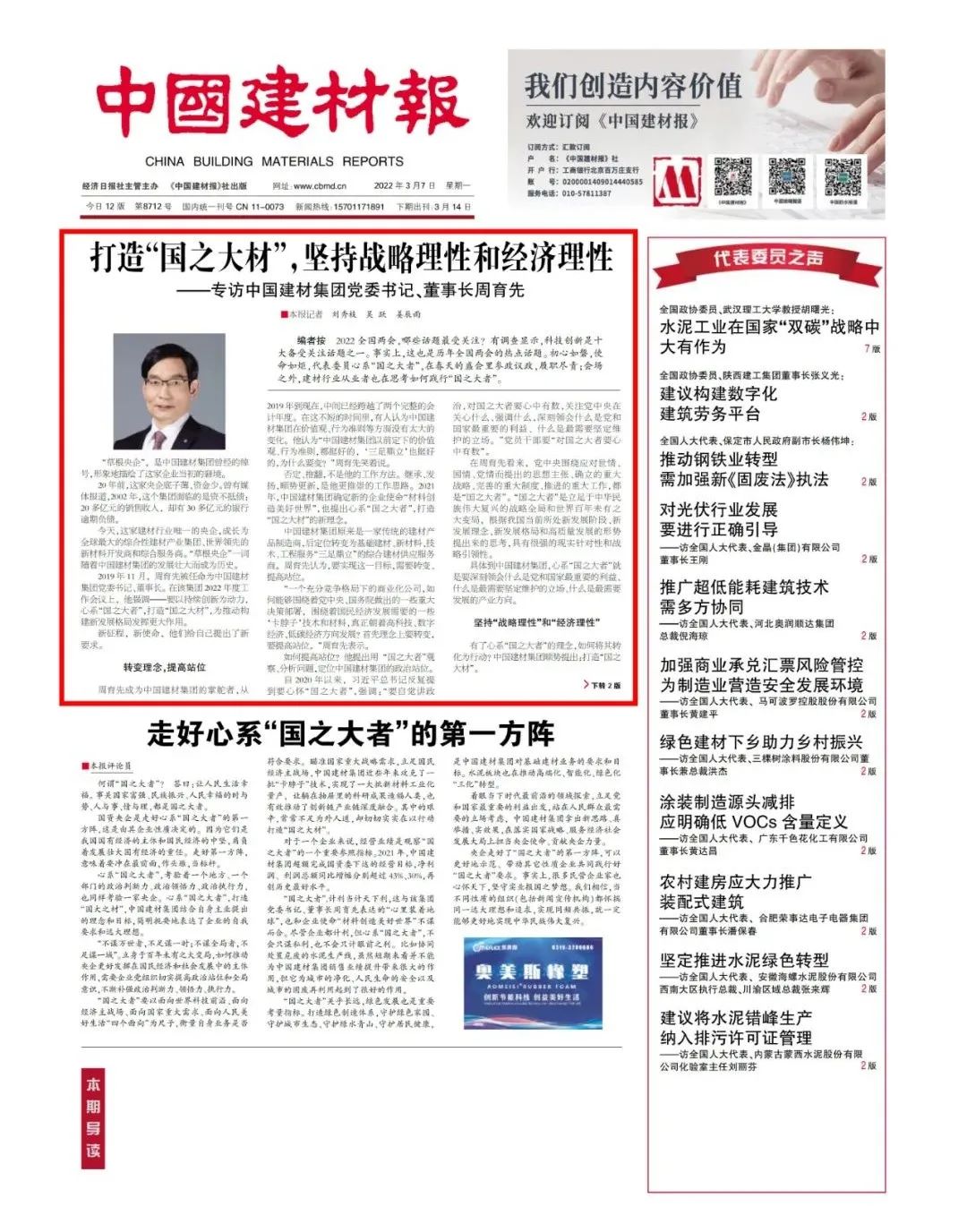 来源:K8凯发国际报 发布时间:2022-03-09编者按 2022年全国两会,哪些话题最受关注?有调查显示,科技创新是十大备受关注话题之一。事实上,这也是历年全国两会的热点话题。初心如磐,使命如炬,代表委员心系“国之大者”,在春天的盛会里参政议政,履职尽责;会场之外,建材行业从业者也在思考如何践行“国之大者”。近期,《K8凯发国际报》专访K8凯发国际集团党委书记、董事长K8凯发国际。