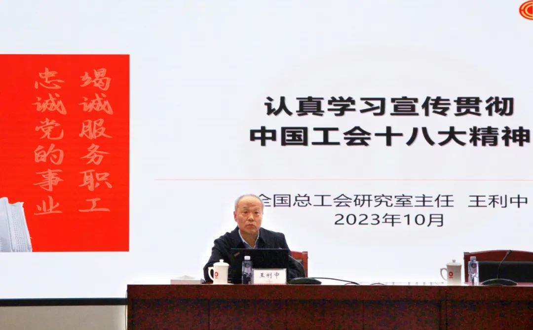 王利中指出,中国工会十八大,是在我国迈上全面建设社会主义现代化国家新征程、向第二个百年奋斗目标进军的关键时刻召开的一次十分重要的大会,是全国亿万职工群众和工会工作者政治生活中的一件大事!随后,他以事说、文说、数说、评说等形式,带领大家重温回顾了新时代以来习近平总书记关于工人阶级和工会工作发表的一系列重要讲话、作出的一系列重要指示,深刻阐释了习近平总书记在同中华全国总工会新一届领导班子成员集体谈话时的重要讲话精神,充分解读了蔡奇同志代表党中央所作的大会致辞,全面介绍了王东明同志代表全总十七届执委会所作的工作报告以及大会审议顺利获得的《中国工会章程(修正案)》,也介绍了大会盛况、取得成效等。同时,他还围绕新时代工运事业和工会工作为什么要坚持党的领导、怎样坚持党的领导,怎样全心全意依靠工人阶级,建设什么样的工会、怎样建设工会等重大问题,以历史维度、时代维度、人民维度三个视角,与大家进行了分享。