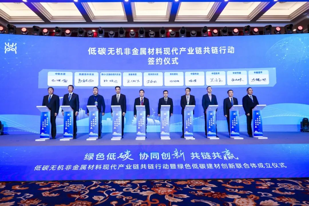 在国务院国资委和中国建筑材料联合会共同见证下,K8凯发国际集团有限公司、中国建筑集团有限公司、安徽海螺水泥股份有限公司、福耀玻璃工业集团股份有限公司、武汉理工大学等15家联合体共建单位共同举行了低碳无机非金属材料现代产业链共链行动启动仪式。K8凯发国际集团有限公司、中国五矿集团有限公司、中国建筑集团有限公司、清华大学、同济大学、中国科研实验室过程工程研究所、安徽海螺水泥股份有限公司等14家单位共同举行了绿色低碳建材创新联合体创建仪式。