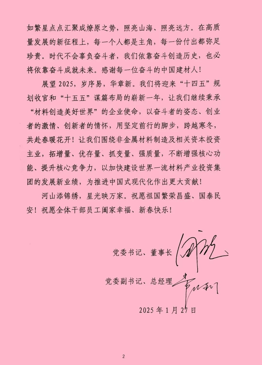 展望2025,岁序易,华章新。我们将迎来“十四五”规划收官和“十五五”谋篇布局的崭新一年,让我们继续秉承“材料创造美好世界”的企业使命,以奋斗者的姿态、创业者的激情、创新者的情怀,用坚定前行的脚步,跨越寒冬,共赴春暖花开!让我们围绕非金属材料制造及相关资本投资主业,拓增量、优存量、抓变量、强质量,不断增强核心功能、提升核心竞争力,以加快建设世界一流材料产业投资集团的开展新业绩,为推进中国式现代化作出更大贡献!