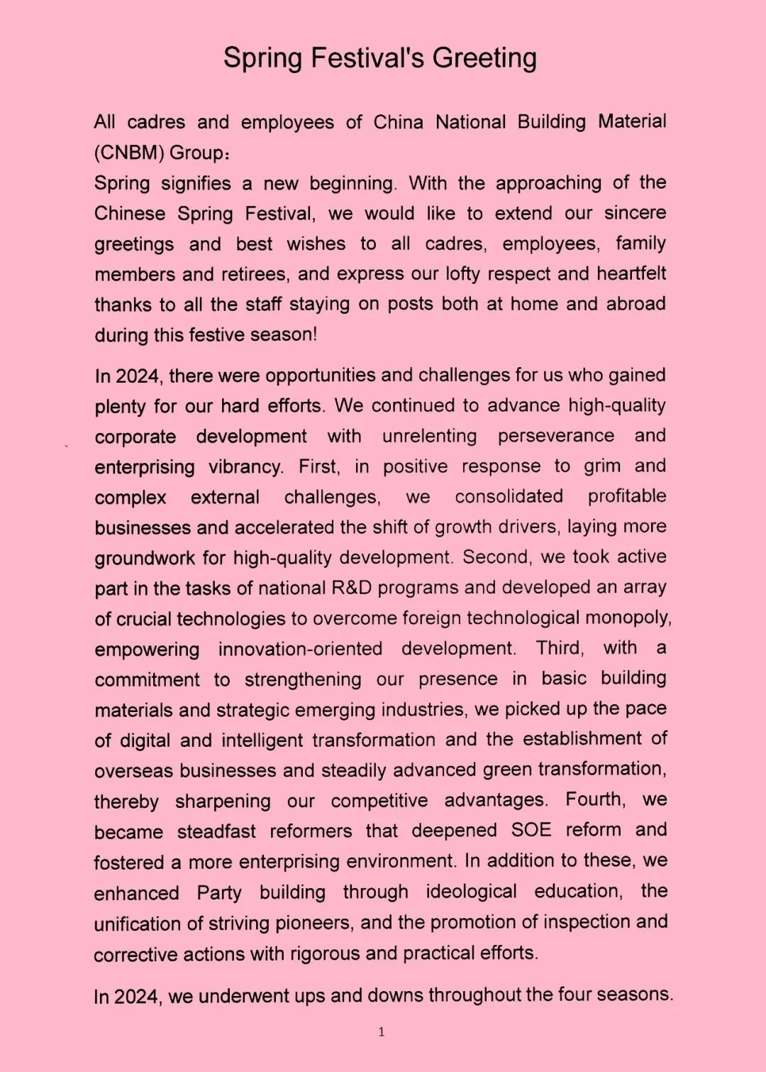 Spring signifies a new beginning. With the approaching of the Chinese Spring Festival, we would like to extend our sincere greetings and best wishes to all cadres, employees, family members and retirees, and express our lofty respect and heartfelt thanks to all the staff staying on posts both at home and abroad during this festive season!