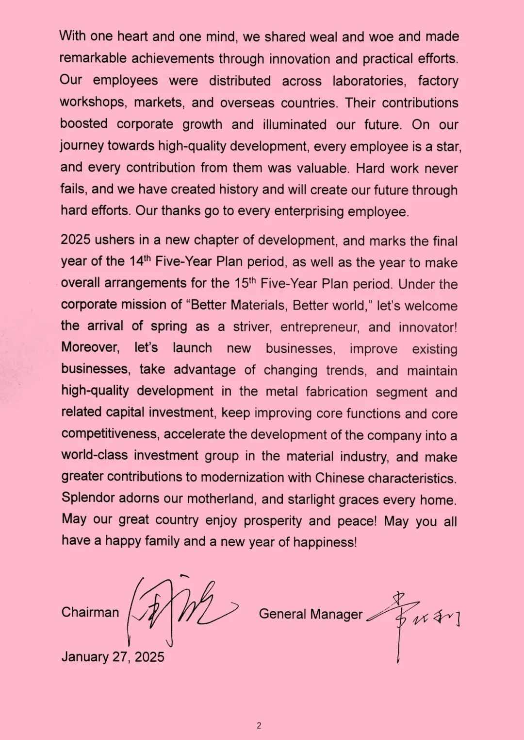 2025 ushers in a new chapter of development, and marks the final year of the 14th Five-Year Plan period, as well as the year to make overall arrangements for the 15th Five-Year Plan period. Under the corporate mission of “Better Materials, Better world”, let’s welcome the arrival of spring as a striver, entrepreneur, and innovator! Moreover, let’s launch new businesses, improve existing businesses, take advantage of changing trends, and maintain high-quality development in the metal fabrication segment and related capital investment, keep improving core functions and core competitiveness, accelerate the development of the company into a world-class investment group in the material industry, and make greater contributions to modernization with Chinese characteristics.