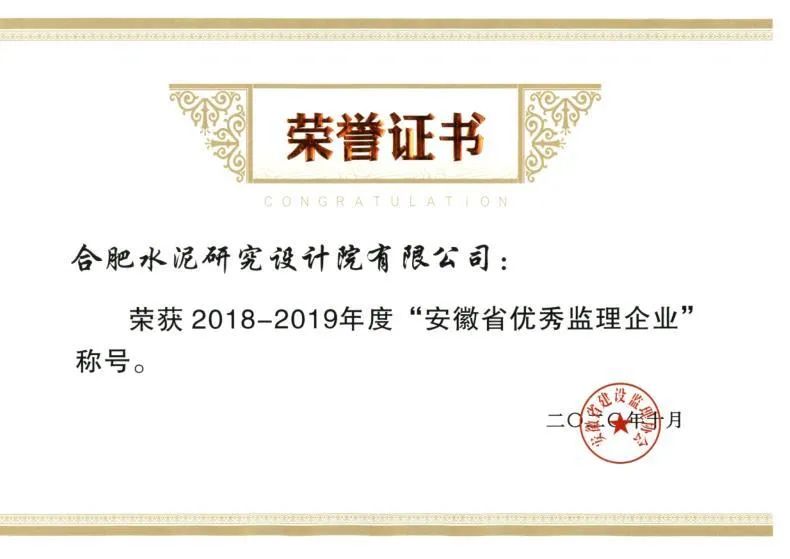 近期,安徽省建设监理协会公布了《关于表扬2018-2019年度安徽省优秀监理企业、优秀总监理工程师、优秀监理工程师的通知》,合肥院荣获2018-2019年度“安徽省优秀监理企业”荣誉称号,合肥院监理公司何宏涛、罗章荣获2018-2019年度“安徽省优秀总监理工程师”荣誉称号。