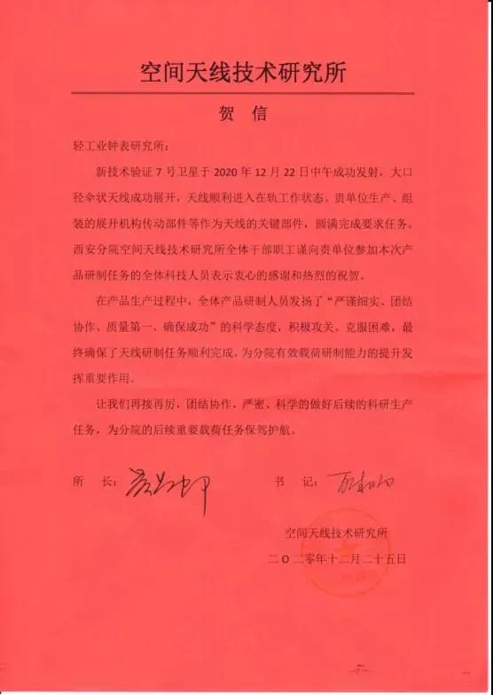 近期,西安钟表所收到空间天线技术研究所贺信。在航天五院2020年的收官之星——新技术验证7号卫星发射过程中,天线所研制的大口径伞状天线成功展开。在产品生产过程中,天线所和钟表所产品研制人员持续攻关,克服困难,确保了天线研制任务顺利完成。其中,钟表所配套加工装调的天线展开组织传动部件产品得到了天线所的赞许和认可。2021年,双方将密切合作,一起为我国航天事业贡献更大力量。