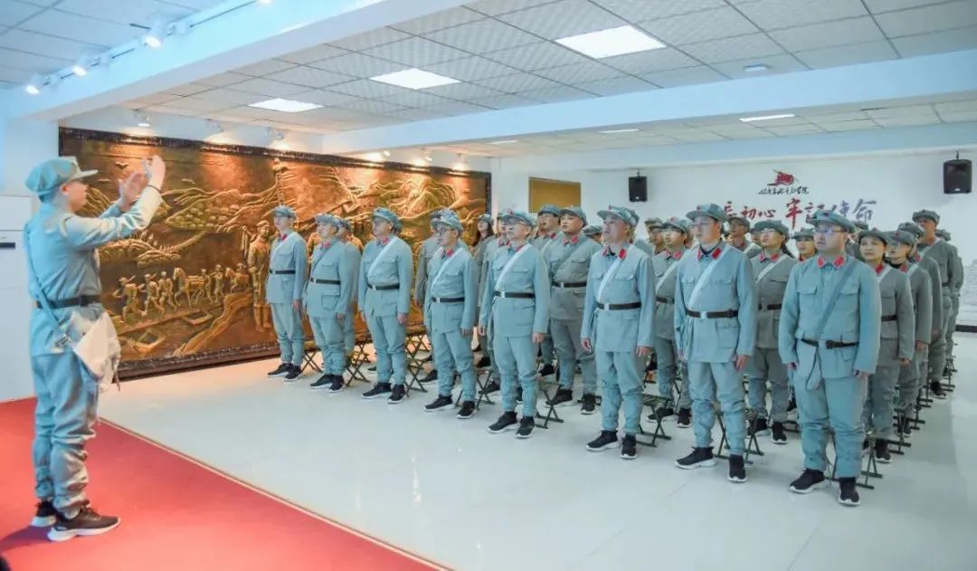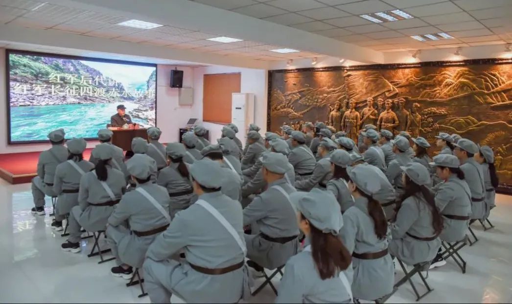 在四川长征干部学院,全体党员身着红军军装,聆听四渡赤水红军战士后代——75岁的胡敬华老人讲述父辈长征时期的真实感人故事,光辉历史历历在目,不禁湿润了眼眶。随后,全体党员分组学习品读了《王尔琢的“托孤书》等红色家书,朗诵了《七律·长征》等红色经典诗词,并集体大合唱《没有共产党就没有新中国》,以表达心中对党的真挚情感。
