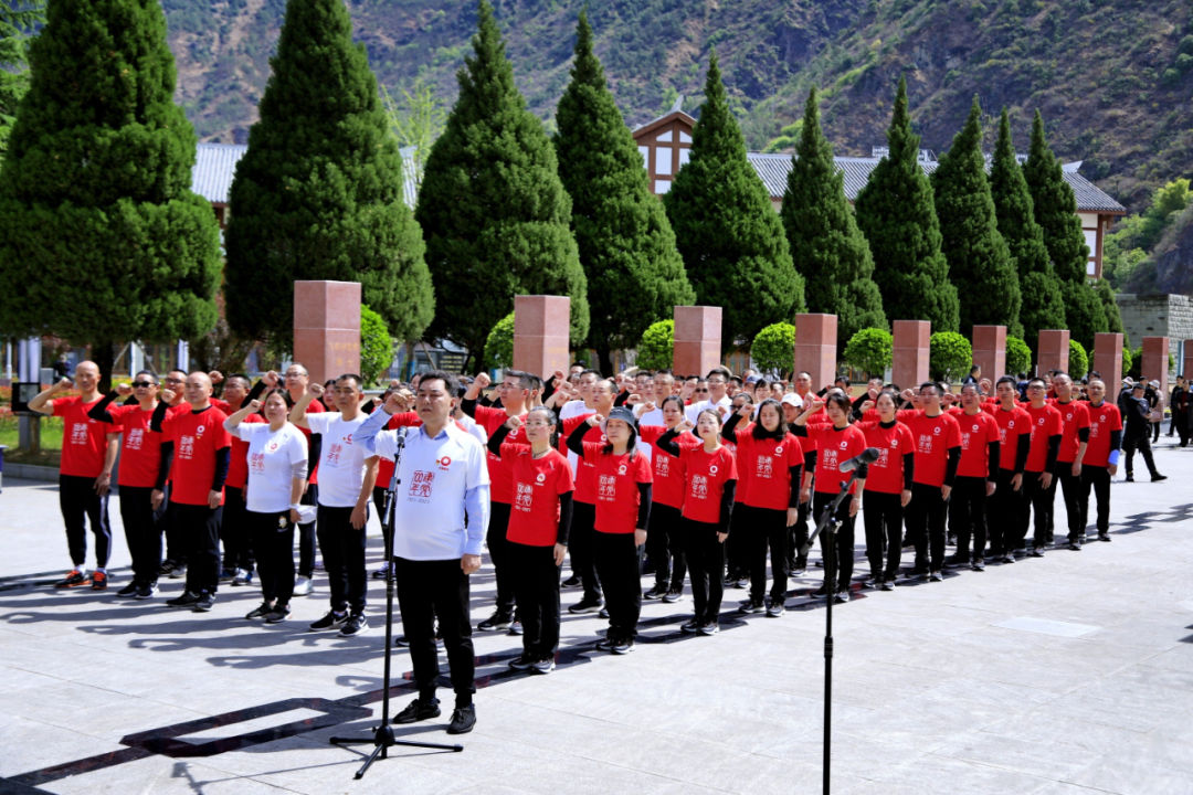 全体人员围着红军飞夺泸定桥纪念碑站成“爱心”形状,集体合唱歌曲《没有共产党就没有新中国》,歌声嘹亮,响彻整个纪念碑公园,表达了全体党员对党的忠诚与信仰。