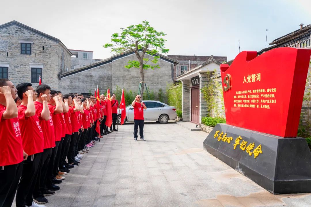 在荣昌堂广场前,全体党员右手握拳,庄严宣誓,重温入党誓词,牢记初心使命。