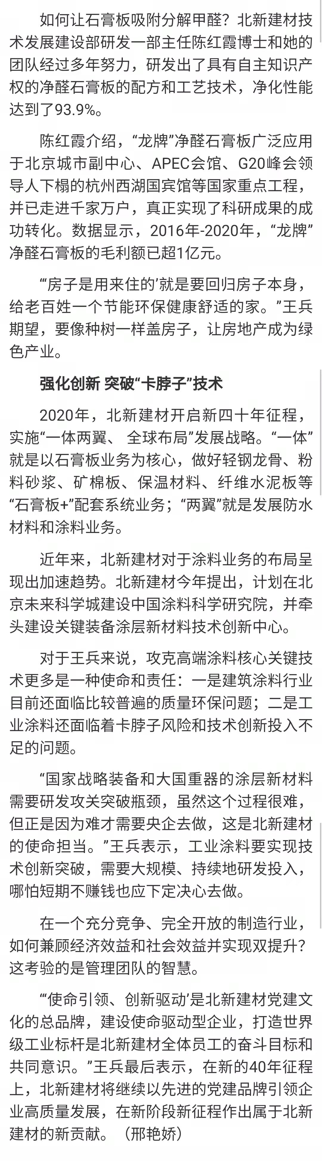 在采访环节,媒体围绕促进企业高质量开展”“北新建材双线择优管理模式与九宫格管理法”“如何解决行业‘卡脖子’问题”“疫情下如何拓展海外市场”以及“面对机遇与挑战迅速行动”等主题展开访谈。北新建材党委书记、董事长王兵,技术开展建设部研发一部主任陈红霞博士等分别从不同角度向媒体介绍了北新建材的情况并为媒体答疑解惑。