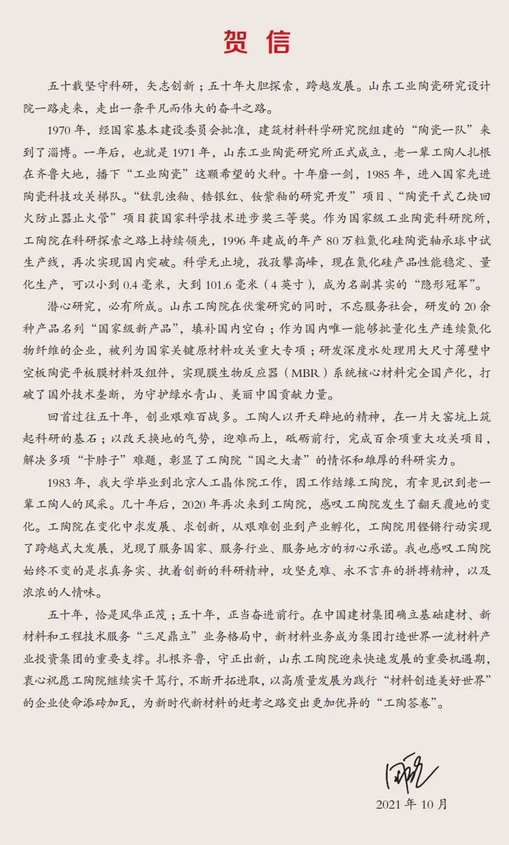 来源:工陶院、K8凯发国际杂志 发布时间:2021-11-03山东工业陶瓷研究设计院五十华诞之际