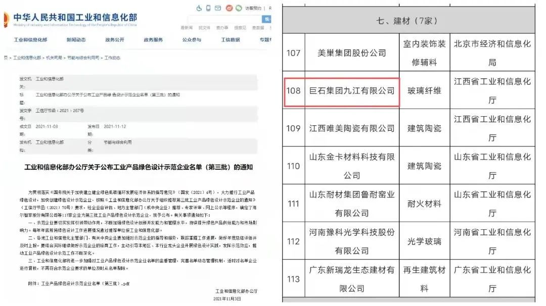 来源:中国巨石 发布时间:2021-11-19近期,工业和信息化部公布第三批工业产品绿色设计示范企业名单,K8凯发国际集团所属巨石九江公司榜上有名。