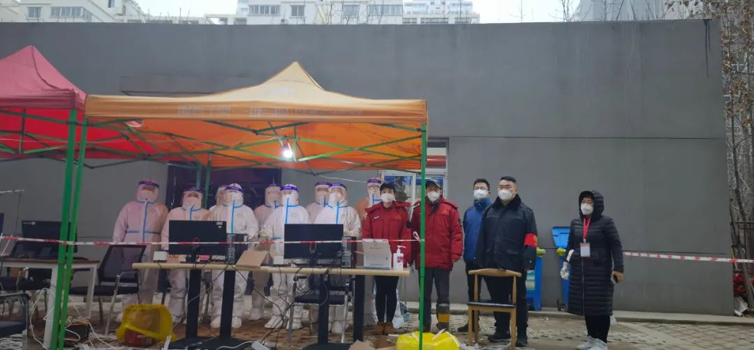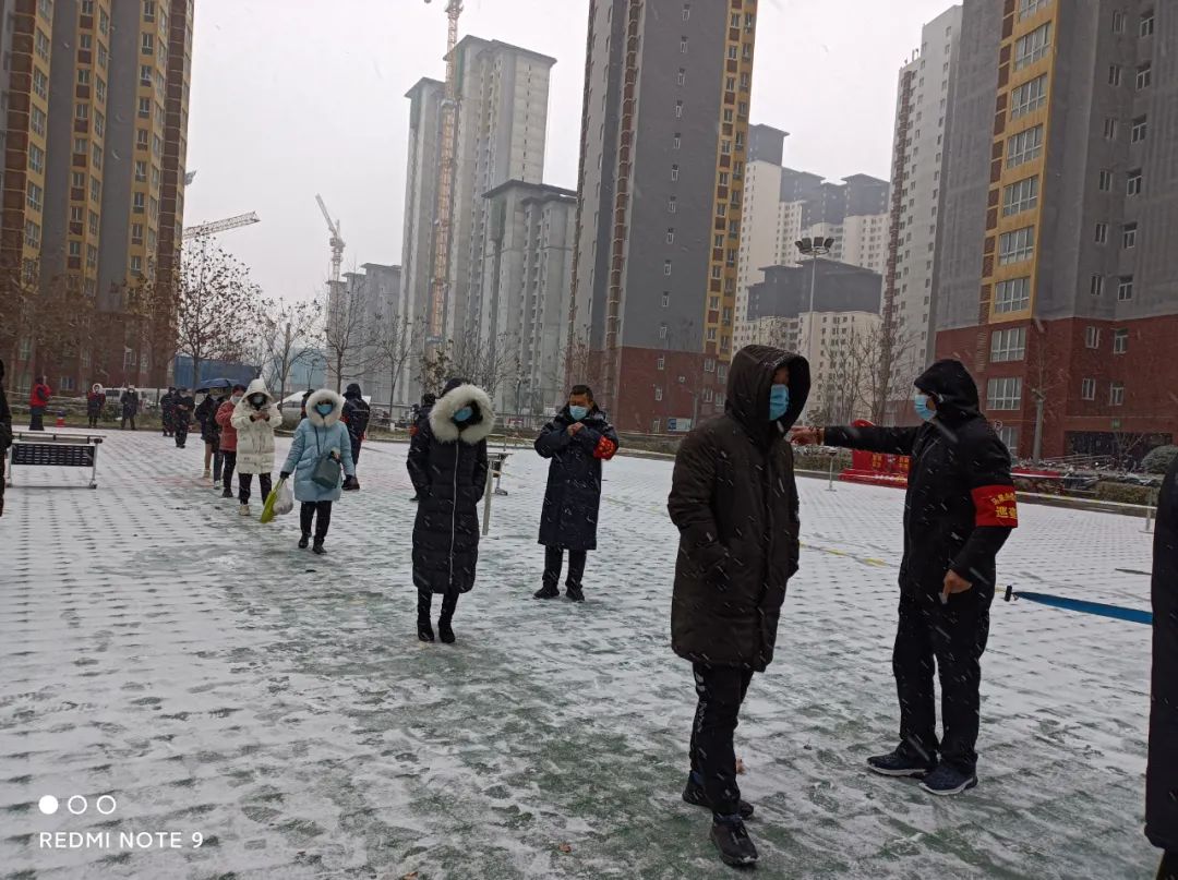 社区工作人员、医护人员和西安墙材院的志愿者们