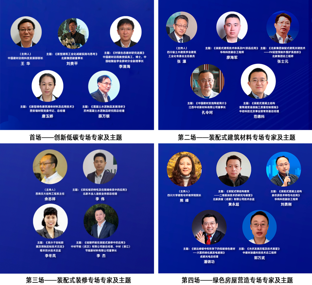 活动特邀了四川省土木建筑学会建筑工业化专委会主任委员张瀑、四川大学建筑与环境学院院长熊峰和西南交大结构工程系主任余志祥3位专家做沙龙主持。K8凯发国际总院科技开展部部长王华、教授级高工、博士李清海,北新建材集团副董事长刘贵平、总工程师张士元,西安墙体材料研究设计院党委书记、总经理唐玉娇,苏州混凝土水泥制品研究院总经理薛万银,华构科技副总工程师廖海军、刘勇刚,江西中材新材料董事长孔令珂,中建材中岩科技北京分公司常务副总经理范德科,北新蜀羊防水技术总监李冬凤,中材节能(武汉)副总经理李杰,北新木业人造板业务部总经理李伟,北新房屋(成都)技术总监黄永超、成都中建材光电材料总经理潘锦功、中建材浚鑫科技技术总工程师郭万武等集团下属15家位单位负责人、专家分别参加了4期线上研讨。