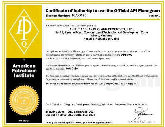 近期,阿克苏天山公司成功取得由美国石油协会颁发的“API Q1油井水泥体系认证证书。”APIQ1油井水泥体系认证证书的殊荣,是公司在技术创新、质量管控上一个质的飞跃,公司将严格执行API组织发布的石油设备技术规范生产油井水泥,增加产品结构,拓宽水泥销售市场,提高市场占有率,将优质的产品给予给客户,为公司绿色健康可持续开展奠定坚实基础。
