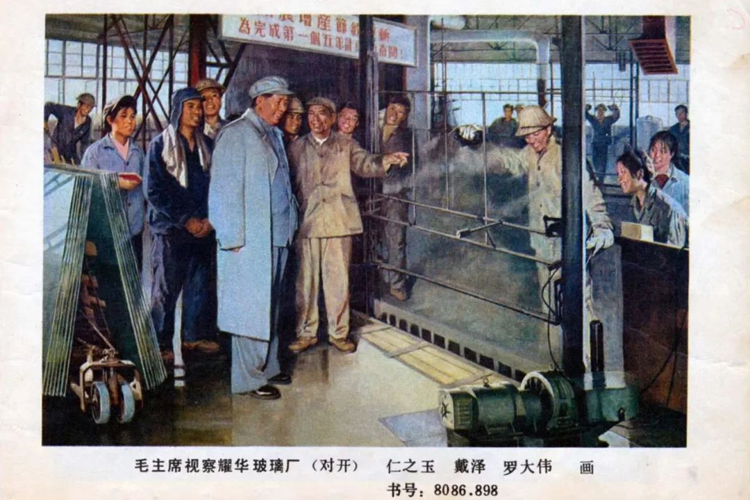 和毛主席同来的有中央办公厅主任杨尚昆同志、铁道部部长膝代远同志、天津市市委书记黄火青同志和知名民主人士李烛尘先生。毛主席从引上窑上楼到了采板场,看到一架一架的整片玻璃十分高兴。在工人崇敬而喜悦的注视下,毛主席等领导同志来到切装车间。进了车间门往左一拐,看到工人切玻璃。工人把整片玻璃双手一提“腾”地一下,铺在切桌上,就像空中飘起一张极平的纸轻轻贴落在案面上。毛主席站在这里,凝神观看。工人把切好的玻璃搬下来,顺势回头一看,才知是毛主席,想说什么又没说出来,显得非常激动。工人那种铺玻璃切玻璃的动作,十分娴熟,主席露出赞许的笑容。