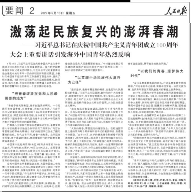 中材国际持续落实青年精神素养提升工程,扎实有效召开团员青年政治理论学习,公司党委书记主讲《青年成长与国家开展》专题团课;各级党政领导累计讲授青年精神素养提升工程主题团课36次,团干部讲团课37次,覆盖各级团组织98个,团员青年2987人。所属中材建设南非公司团员青年参加驻约堡总领馆在南青年线上研讨会,并就青年如何在“十四五”建功立业发表感言;法国项目青年员工接受人民日报访问,畅谈学习习近平总书记在庆祝中国共产主义青年团创建100周年大会上的重要讲话感受。