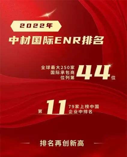 近期,2022年度美国《工程新闻纪录(ENR)》“全球最大250家国际承包商”榜单发布,中材国际再次上榜,位列全球44位,同比上升16位,位列上榜中国企业11位,同比上升2位。