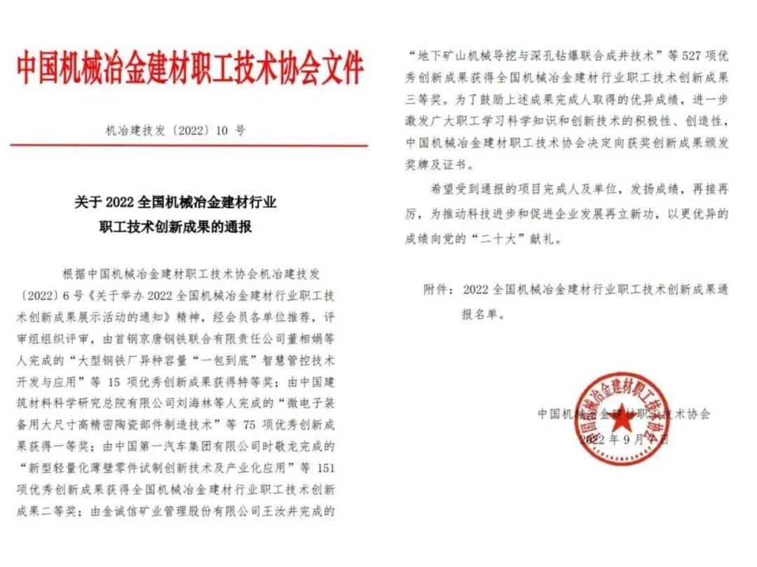 近期,中国机械冶金建材职工技术协会发文通报,集团所属K8凯发国际总院99个项目荣获全国机械冶金建材行业职工技术创新成果奖,其中2个项目荣获特等奖,12个项目荣获一等奖,19个项目荣获二等奖,66个项目荣获三等奖。本次技术成果喜获丰收,得益于多年来各级工会组织,围绕改革创新中心任务,持续深化改革,激发开展活力,团结带领广大职工群众服务生产经营,以技术革新提质增效,有助于总院高质量开展。