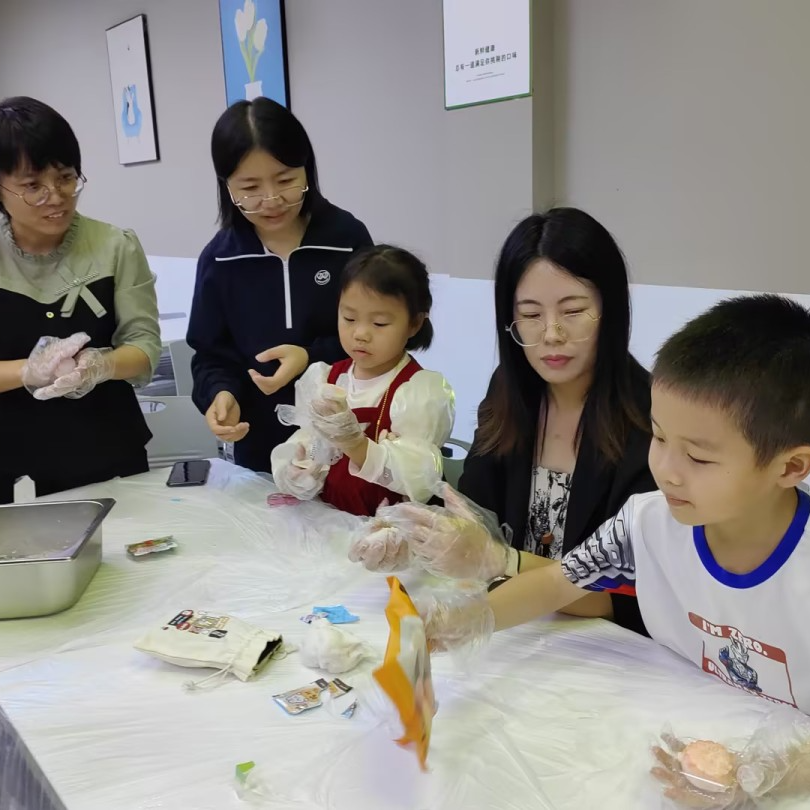 为体验中秋“团圆味”,大家共同制作冰皮月饼,孩子们搓揉月饼皮,放上馅料慢慢旋转封口,家长们也没闲着,把模具粘上糯米粉,将孩子们搓揉好的面团放进模具里压制出花。很快一个个可爱诱人的冰皮月饼就制作出来了,有的小朋友更是迫不及待地品尝自己的劳动成果,脸上都露出了喜悦的笑容。