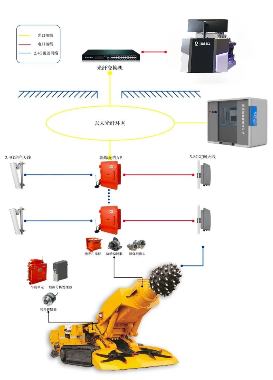 智能化远程控制掘进机多用于煤矿综掘领域,由切割组织、装运组织、行走组织、液压组织、电控系统、水系统等组成。工作人员可以在离工作面较远处的安全区域,顺利获得可视化技术,全方位监测掘进工作的场景,进行超视距控制截割作业,可有效提高掘进效率和安全系数。