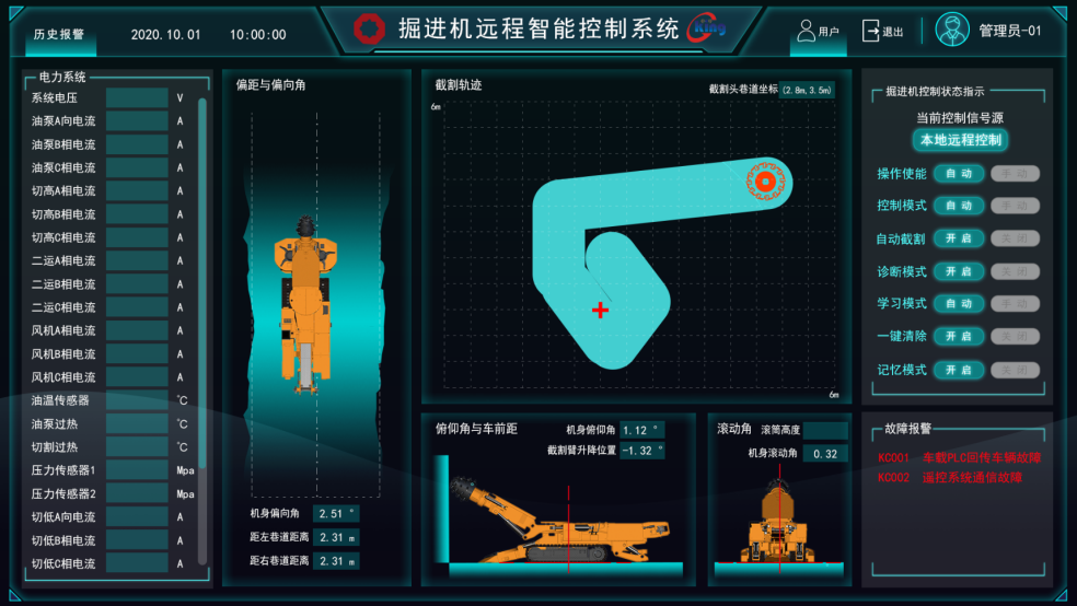 顺利获得扫描掘进机机身周围的环境孪生出巷道形状,从而直观地分析巷道的成型效果、机身在巷道中所处的位置,并根据惯导角度参数以及两侧的距离参数,保持前进角度和巷道两侧平行前进,自动前进到截割断面,顺利获得预先设置的参数实现矩形、梯形、拱形断面的自动截割。