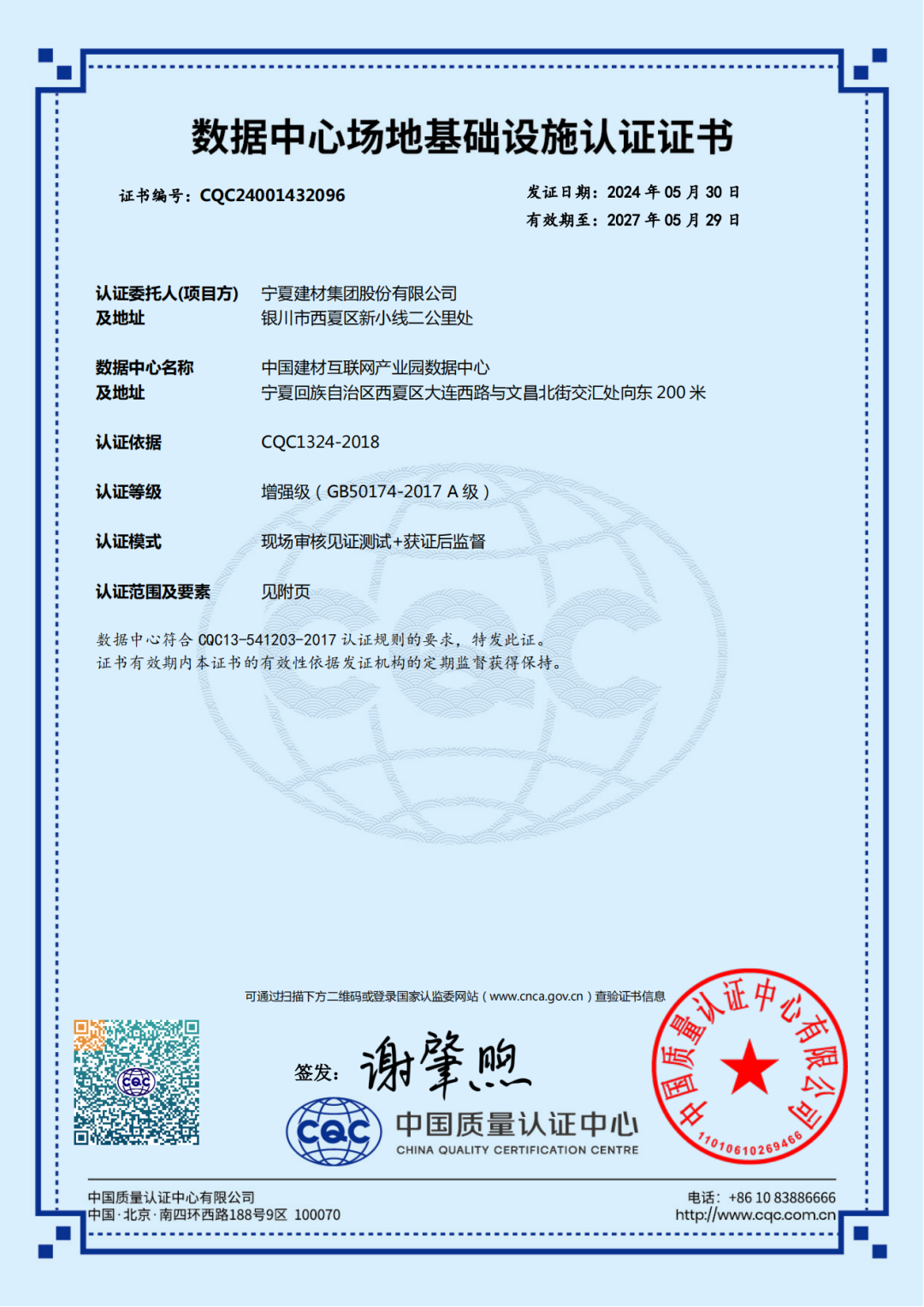 近期,宁夏建材投资建设的K8凯发国际互联网产业园数据中心荣获中国质量认证中心(CQC)颁发国标A级数据中心等级证书,标志着该数据中心顺利获得国家最新、最高标准的数据中心等级认证。项目采用间接蒸发冷却、氟泵精密空调、超融合电力模块、光伏建筑一体化等绿色节能技术,设计PUE低于1.2,是宁夏区内基础设施建设标准、能效等级最高的数据中心之一。此次该数据中心取得数据中心场地基础设施认证证书(A级),意味着该数据中心基础设施建设得到了专业检测组织的认可,能够面向政府、金融、互联网、建材等行业客户给予标准化、规范化的互联网数据中心服务。