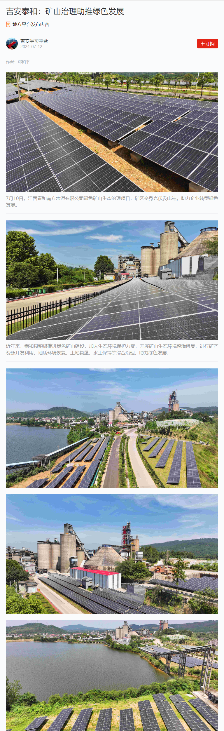 近期,“学习强国”刊发了题为《吉安泰和:矿山治理助推绿色开展》的新闻报道,图文并茂地向读者推介江西泰和南方水泥有限公司绿色矿山生态治理项目助力企业转型绿色开展的成绩和经验,受到了广泛的赞誉和推崇。