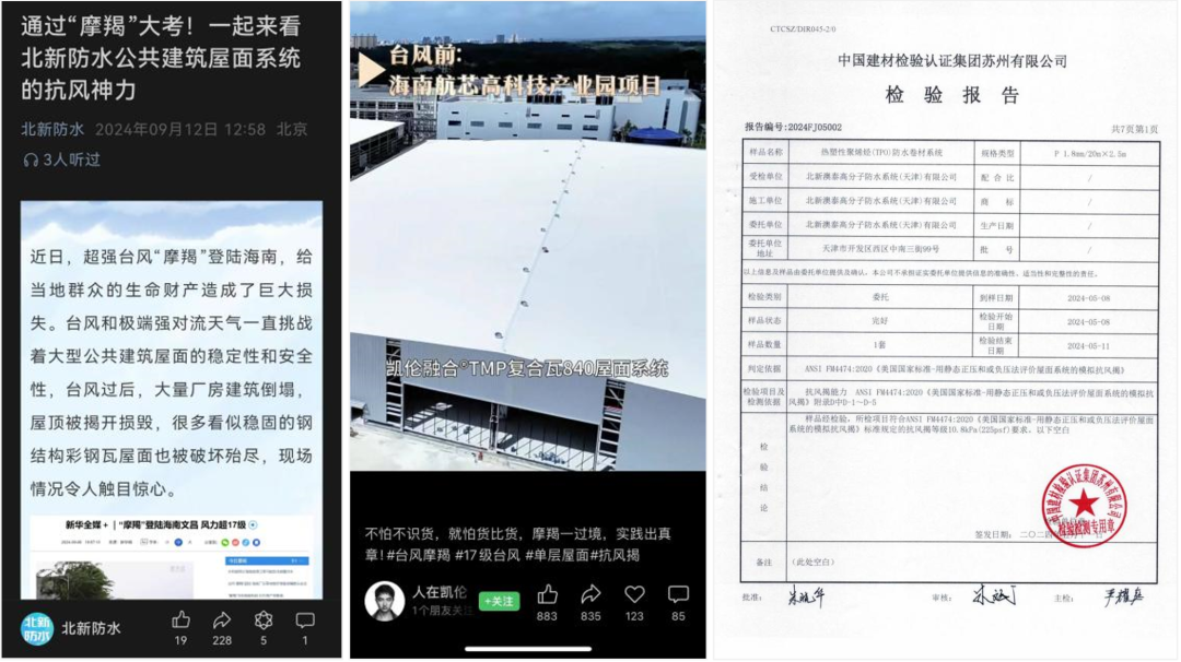 国检集团苏州公司长期致力于建筑屋面系统安全领域检测服务,顺利获得苏州公司抗风揭测试的北新澳泰高分子防水系统(天津)有限公司等企业的产品经受住“摩羯”考验,风灾过后依旧保持着较为完整的功能性。