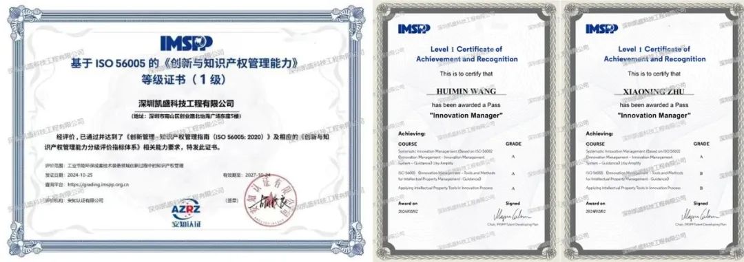 近期,深圳凯盛获颁基于ISO56005国际标准的《创新与知识产权管理能力》1级证书,同时公司2人取得国际认可的《创新管理师》证书,这是公司在知识产权贯标工作方面的新突破,标志着公司在创新管理中的知识产权标准化工作已接轨国际先进水平。