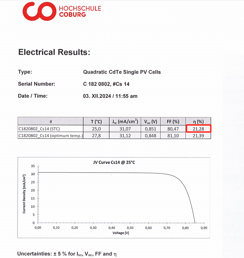 近期,凯盛集团所属德国CTF公司研发的碲化镉发电玻璃电池经德国Hochschule Coburg检测,实验室转化效率达到21.28%,刷新了最新纪录。凯盛集团在国内将 CTF 公司的研发成果成功应用于碲化镉生产转化。截至现在,瑞昌基地、成都基地、邯郸基地的大面积(1.92m2)碲化镉冠军组件先后实现了 17.7%、17.1%、17.26% 的转化效率。这在不断提升发电玻璃核心竞争力的同时,也持续降低了发电玻璃的生产制造成本,进一步提高了凯盛发电玻璃的市场占有率。