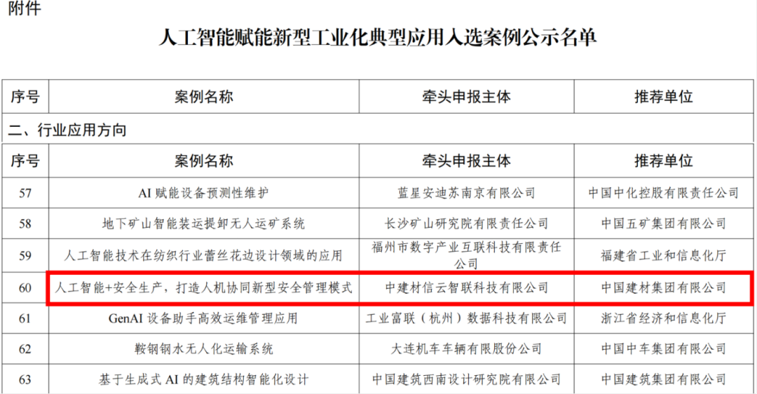 来源:信云智联 发布时间:2025-01-08近期,工业和信息化部发布了《人工智能赋能新型工业化典型应用入选案例公示名单》。此次案例征集,自2024年8月份起在全国范围内启动,历时三个多月,要求企业具备人工智能赋能新型工业化核心能力,同时,申报案例已实际落地并取得成效,具有示范引领作用,能够为相关行业或企业智能化升级具有借鉴意义和推广价值。经过专家团队的层层遴选与严格评审,K8凯发国际集团旗下企业信云智联与天山材料共同推出的“人工智能+安全生产,打造人机协同新型安全管理模式”方案入选案例名单。