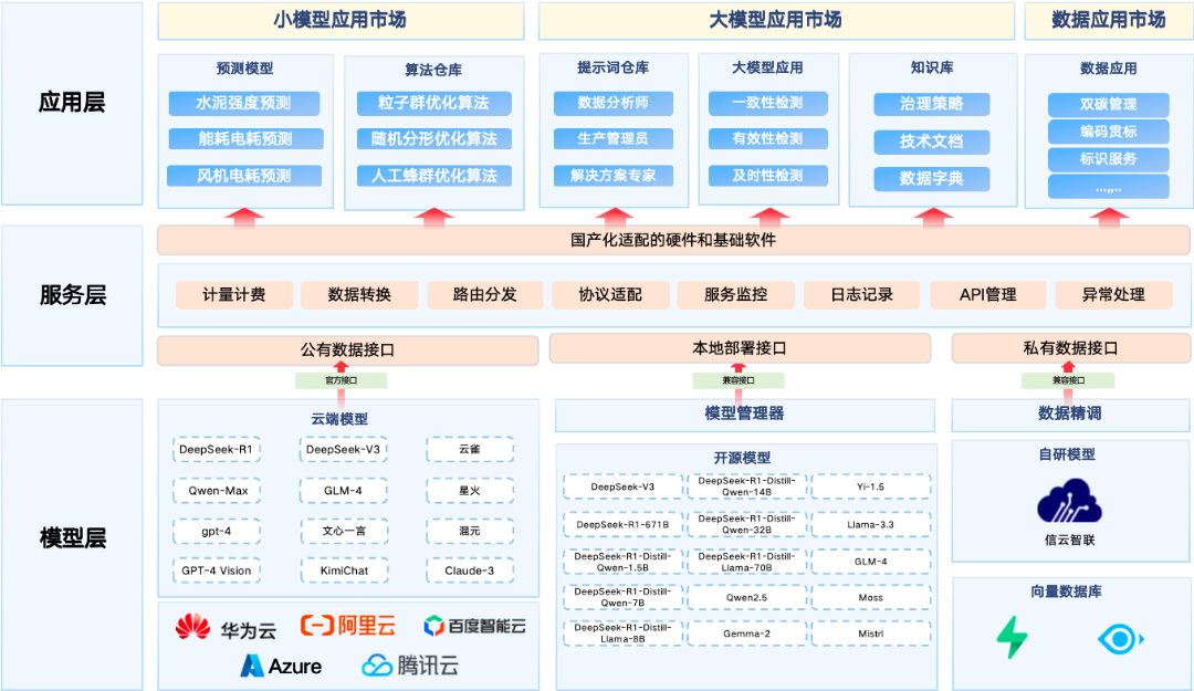 作为较早布局人工智能技术的科技企业,信云智联在大模型领域持续深耕与布局,构建了覆盖大模型开发、服务、应用的全链路解决方案,不仅能够与国内外头部模型集成,还具备自主研发能力,顺利获得蒸馏技术实现不同场景的适配需求,同时还有优良的国产化适配能力,支持灵活部署与服务。现在,信云智联在小模型市场、大模型市场以及数据应用市场,均取得了丰硕的成果,并已在水泥、能源等多个行业中成功落地应用,为行业的智能化升级给予了有力的技术支撑。