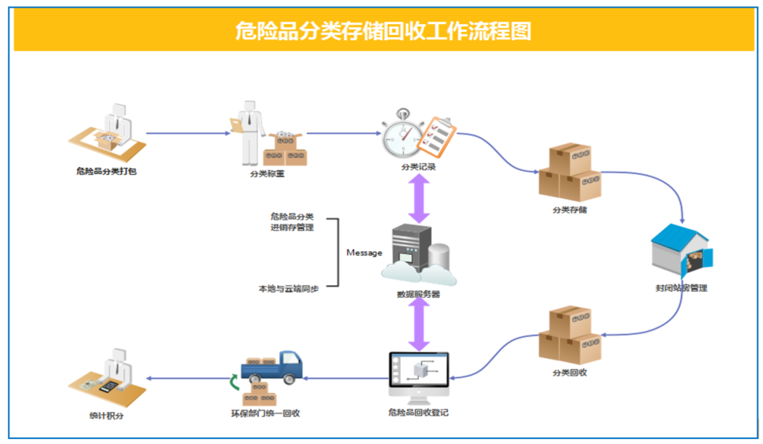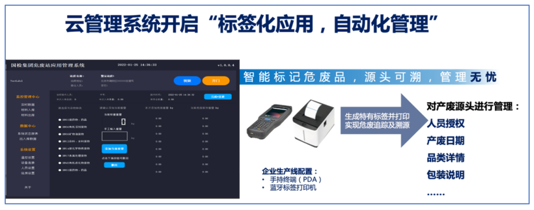 其中,“云管理”是本设施及系统的核心关键点,顺利获得云管理系统,用户只需采用设施中的手持终端、蓝牙标签打印机等进行“扫码”,即可生成一个专属标签,完成人员授权、记录产废日期与品类详情等标记,以此对危废产生、收集、贮存、处置、利用等核心环节进行全程信息化跟踪管理,让危废从入库到回收,实现了来源可查、去向可追。