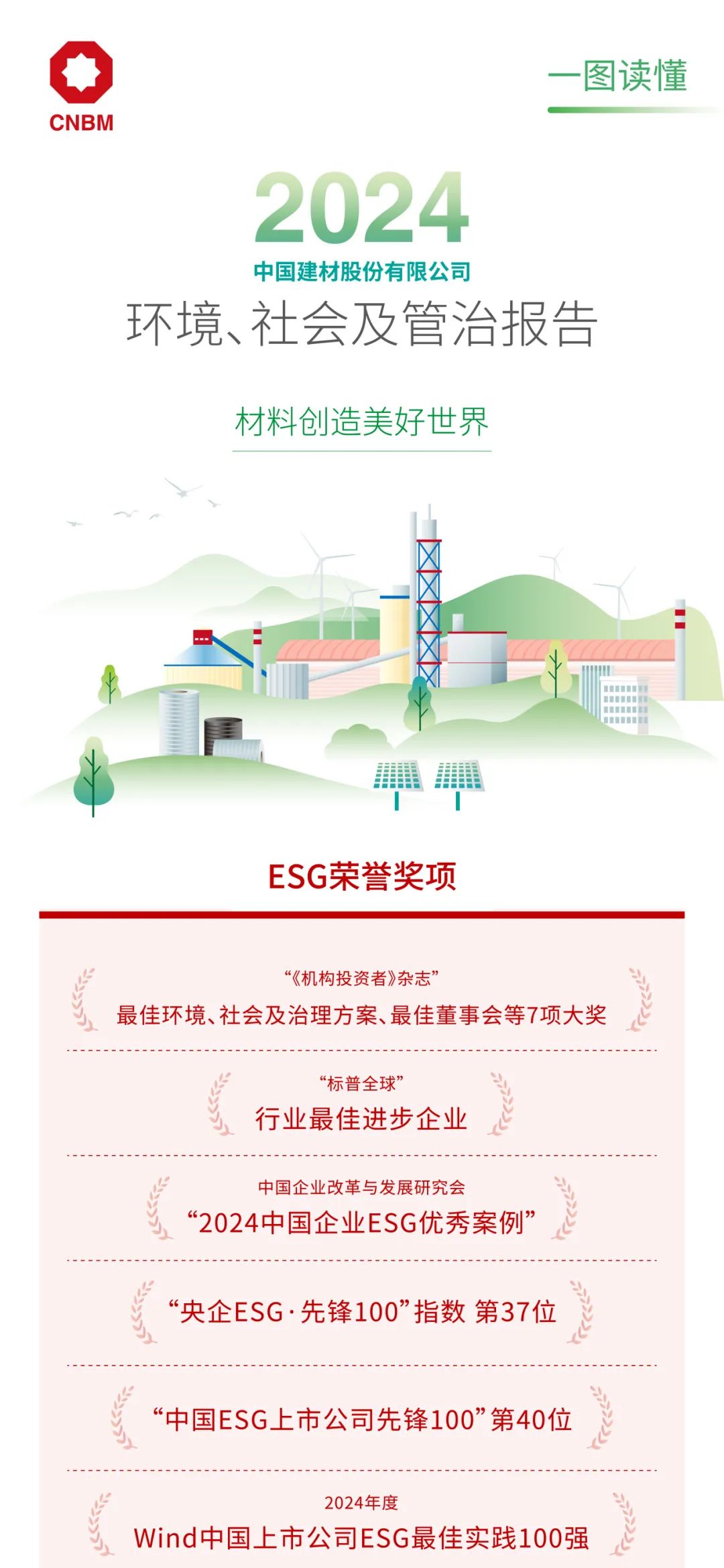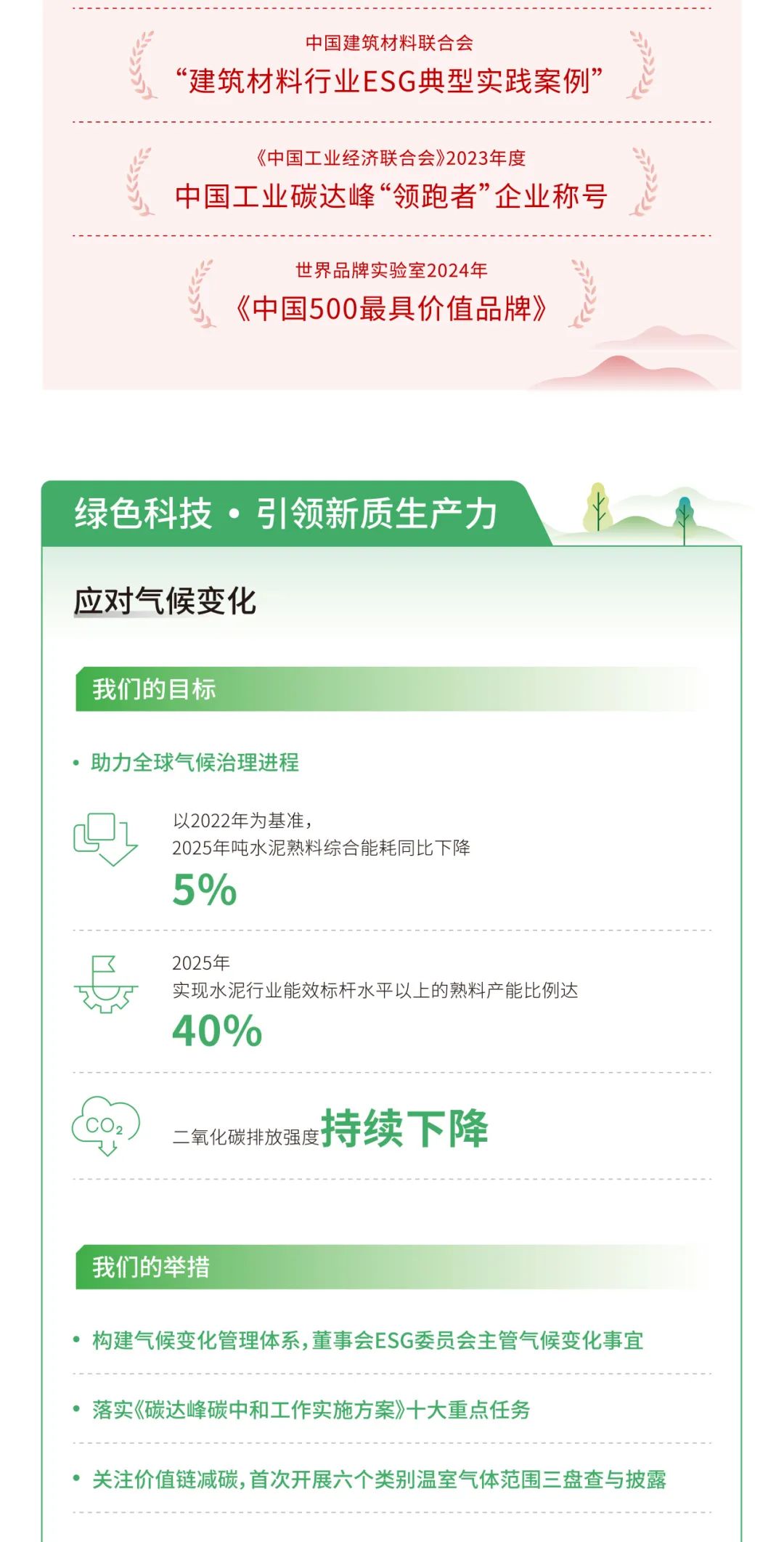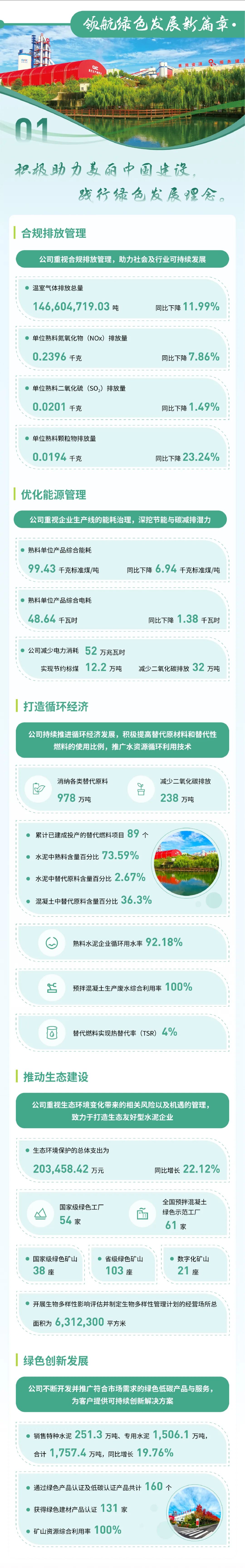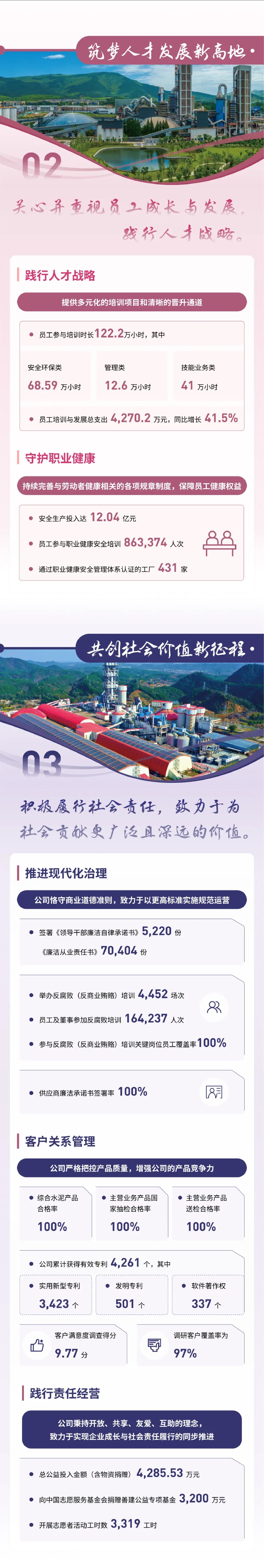 来源:K8凯发国际股份、天山股份 发布时间:2025-04-07作为“中央企业ESG联盟”首批成员企业,K8凯发国际集团持续践行ESG理念,以“材料创造美好世界”为使命,坚持“善用资源、服务建设”的核心理念,秉承“创新、绩效、和谐、责任”的核心价值观,追求环境、社会及管治的协调共赢,将ESG理念最终落实在市场绩效、科技创新、节能环保、员工关爱、企业公民等履责实践之中,并不断建立健全ESG工作机制与管理体系,持续有助于成员企业披露专项报告。现在,已实现集团所属13家上市公司ESG专项报告披露“全覆盖”。