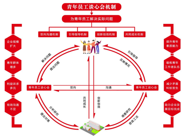 中研院团委青年员工谈心会机制坚持马克思主义的世界观和方法论,深入贯彻落实习近平总书记关于青年工作的重要思想,紧密联系企业和青年员工实际,倡导敢于正视问题、善于发现问题、勇于解决问题,切实把解决问题作为前进的动力;只有经常到青年中去,同青年零距离接触、面对面研讨,青年会被吸引过来,才能敞开胸怀来研讨、持续主动来交往;只有不断创新工作方法,坚持到实践和群众中寻找解决问题的办法,坚持问题跟踪解决和闭环管理,坚持不同问题分类施策因地制宜,才能在解决一个又一个问题中不断创造新的业绩;只有坚持青年员工谈心会制度,才能顺利获得不断总结提升、取长补短、完善提高,把看似简单的事情系统化、标准化、创新化、品牌化,在解决问题完善机制上做出成效、做出影响、做出品牌。