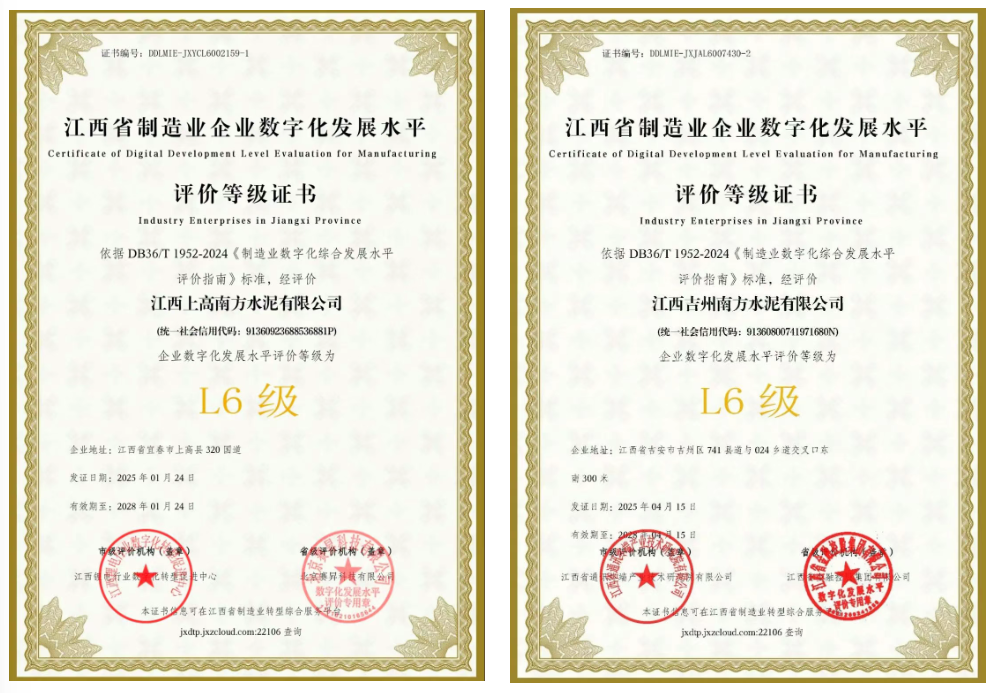 近期,上高南方、吉州南方分别荣获江西省制造业企业数字化开展水平L6级认证。未来,江西水泥将以此为契机,持续深化数字化应用,有助于生产与管理全面升级。