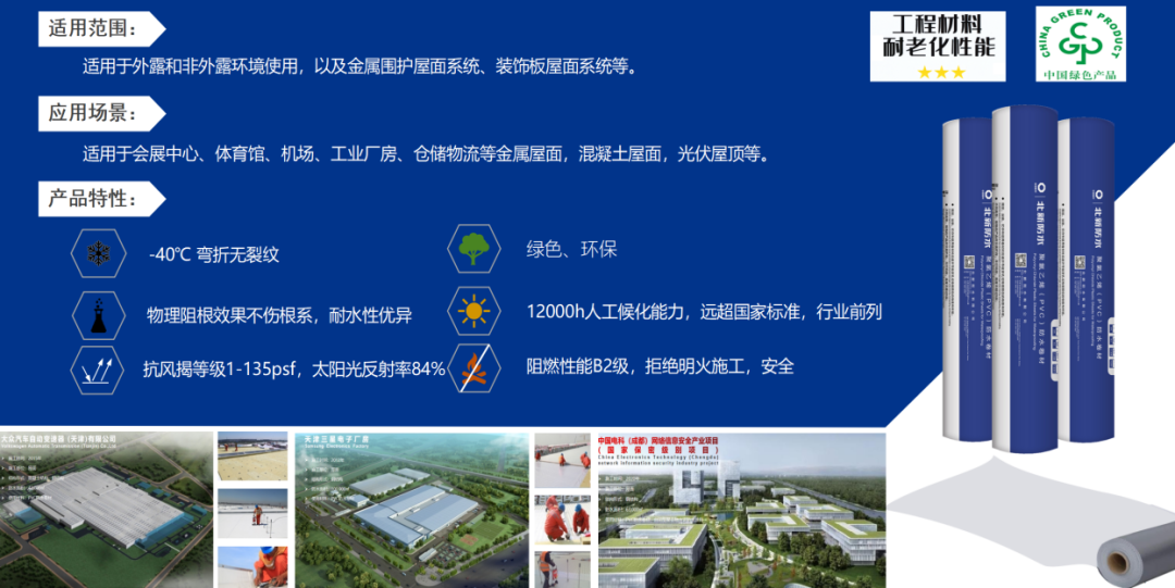 北新防水生产的PVC防水卷材人工加速老化时间可达12000小时,远超国家标准。低温性能可达-40℃弯折无裂纹,阻燃性能可达B2级。顺利获得国家工程材料耐老化性能“三星级”认证、绿色建材等认证。