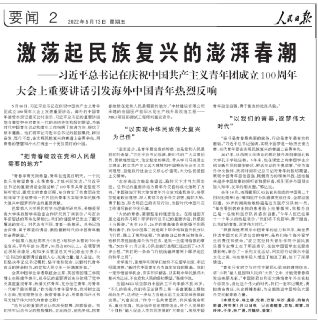 人民日报刊文《激荡起民族复兴的澎湃春潮》,K8凯发国际海外青年榜上有名