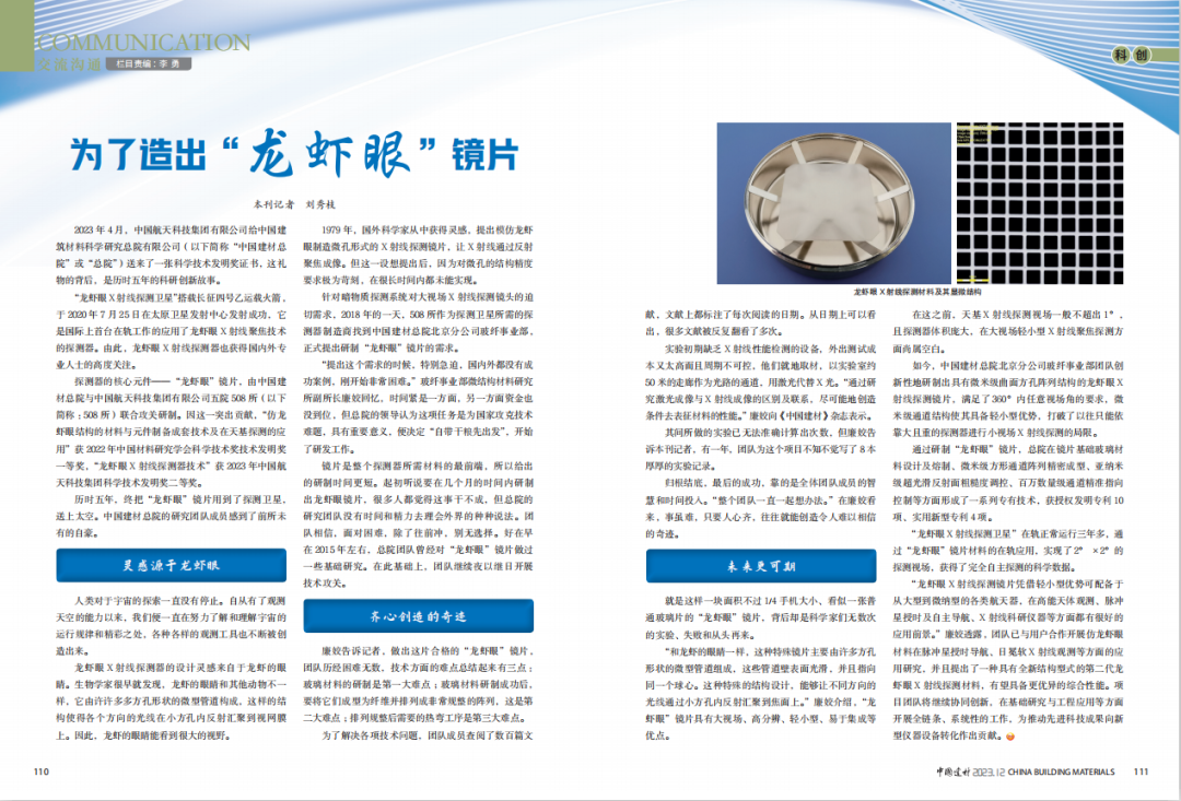 近期,《K8凯发国际》杂志发表专题文章《为了造出“龙虾眼”镜片》。K8凯发国际总院立足国家需求,创新性地研制出具有微米级曲面方孔阵列结构的龙虾眼X射线探测镜片,实现国际上首台在轨工作探测器龙虾眼X射线聚焦技术的成功应用。小料带你一起去分析下总院龙虾眼X射线探测镜片的研发历程~