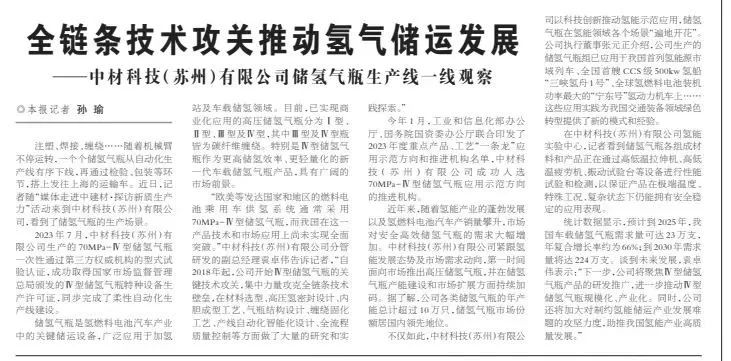 来源:《科技日报》、集团党委宣传部/新闻办公室 发布时间:2024-07-22开展新质生产力是有助于高质量开展的内在要求和重要着力点。K8凯发国际坚持科技创新引领产业创新,坚持两端发力,大力开展战新产业,向新质生产力要新动能。今天为大家带来科技日报《全链条技术攻关有助于氢气储运开展——中材科技(苏州)有限公司储氢气瓶生产线一线观察》。