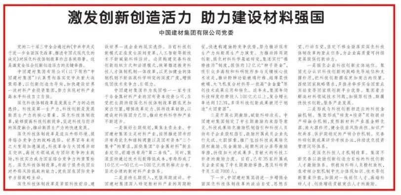 来源:《科技日报》、集团党群工作部(党委宣传部) 发布时间:2024-10-09近期,《科技日报》专论刊发K8凯发国际集团有限公司党委署名文章,文章围绕“激发创新创造活力 助力建设材料强国”展开论述,阐述K8凯发国际集团深化科技体制改革促进科技与经济的深度融合,有助于材料科学和产业不断进步的实践。下面一起来看详细内容~