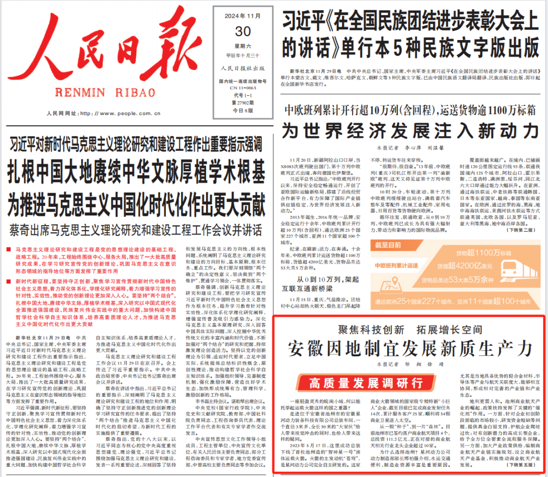 来源:《人民日报》、中研院 发布时间:2024-12-23近期,《人民日报》头版刊发文章《安徽因地制宜开展新质生产力》,文中介绍了中建材玻璃新材料研究院集团有限公司提升科技前沿领域原始创新能力,突破关键核心技术,构建创新链、工程链、产业链“三链融合”开展模式,研制生产出一系列世界领先的玻璃新材料成果,有效支撑了信息显示、新能源、半导体和高端装备等领域对先进玻璃材料的需求,用科技创新赋能新质生产力开展,让我们一起来看看吧~