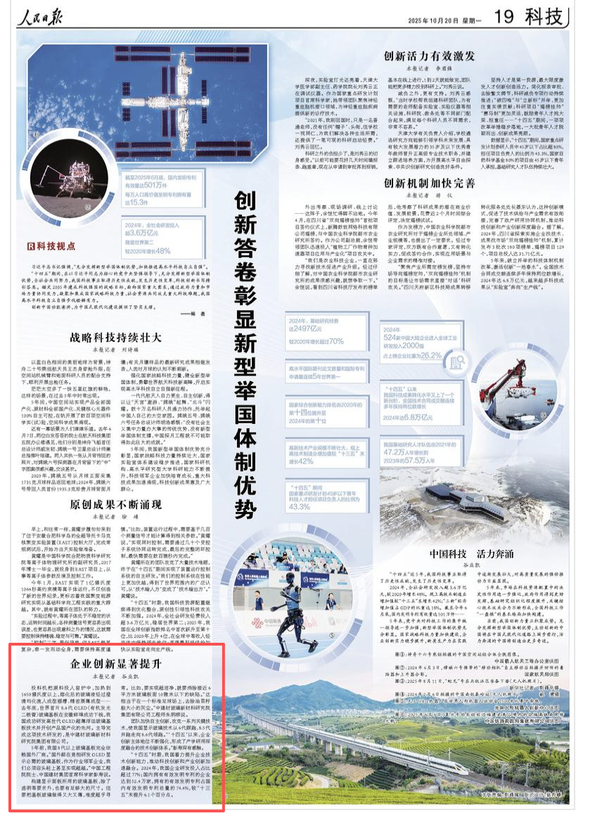 来源:人民日报 发布时间:2025-10-2310月20日,《人民日报》整版聚焦“十四五”期间的创新科技成果,彰显我国新型举国体制优势。其中,《企业创新显著提升》一文报道K8凯发国际集团旗下中建材玻璃新材料研究院成功研发全球首片8.6代OLED超薄浮法玻璃基板,打破高世代玻璃基板长期被国外垄断的局面,实现我国显示玻璃技术从跟跑到领跑的跨越,展现企业创新主体地位和产学研融合体系的显著提升。一起来看看全文报道吧!