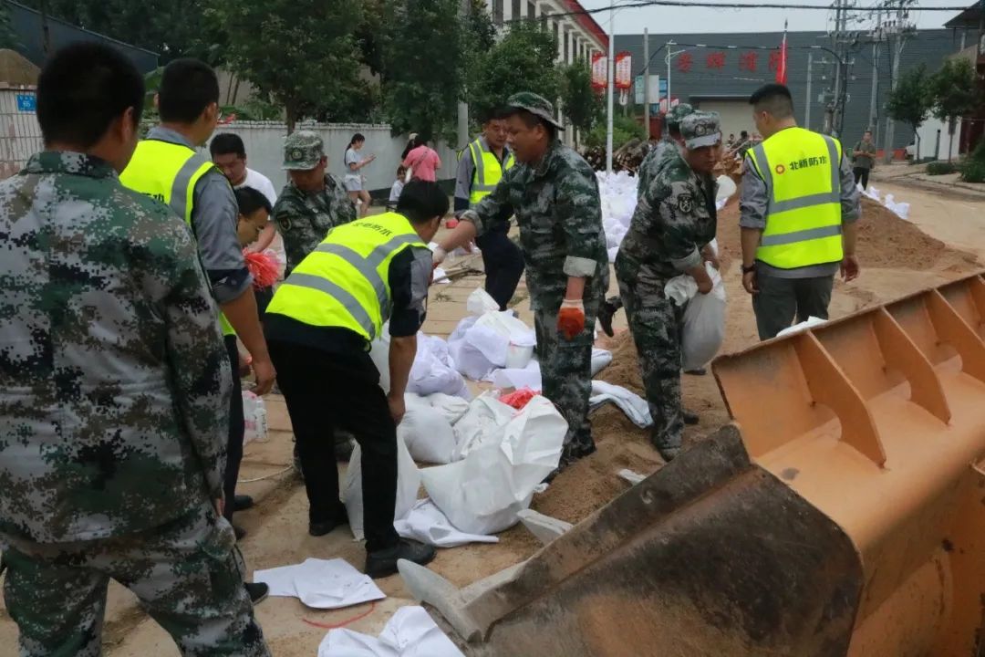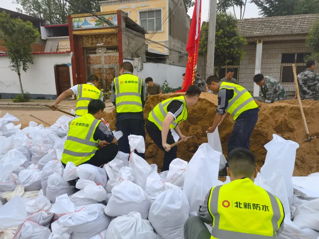 所属北新防水组织创建员工志愿者突击队,在长葛市古桥镇与人民解放军一起堆积沙袋,防止雨水倒灌。