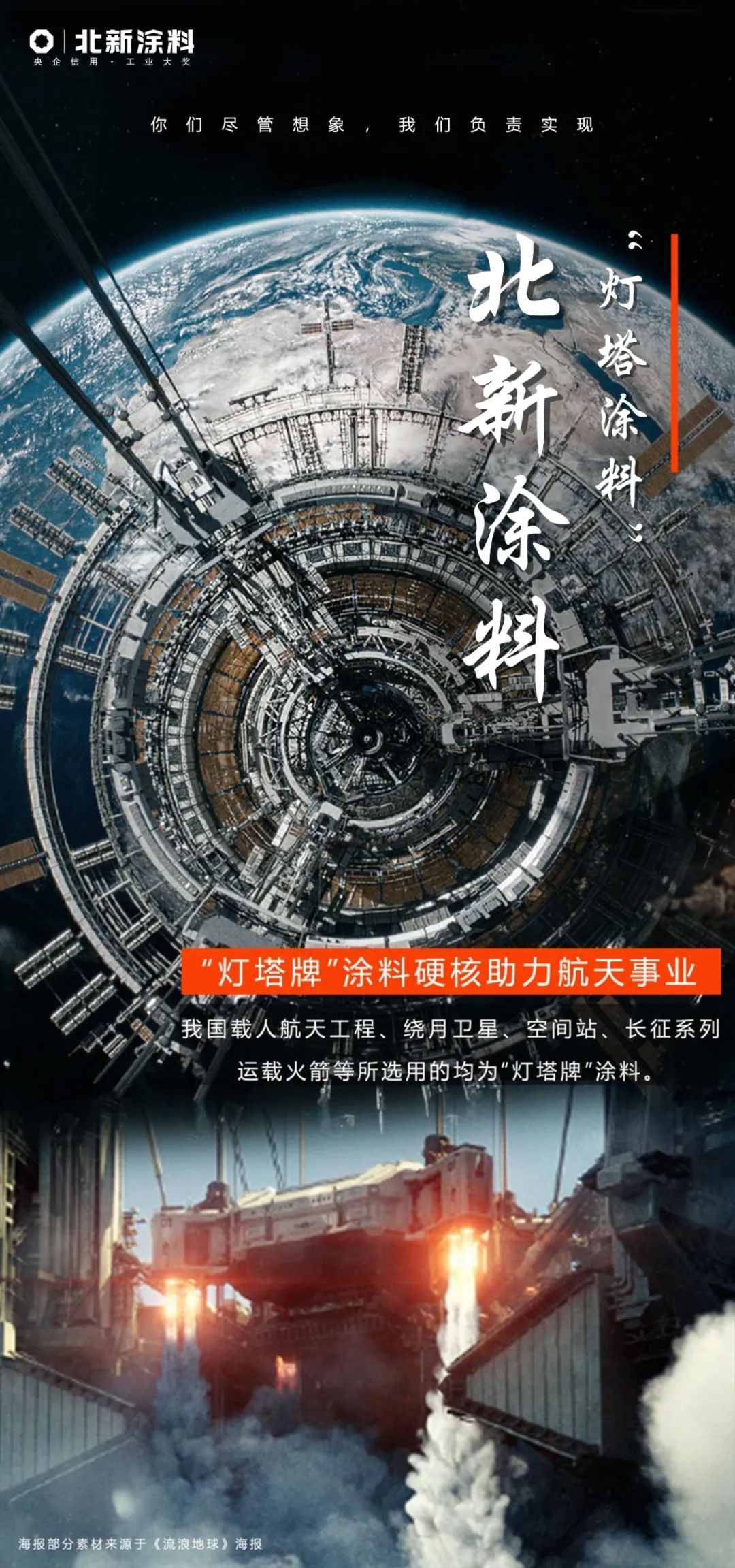 《流浪地球2》中,最引人瞩目的炫酷垂直起降型飞行器不仅拥有“中国心(国产发动机)”,还身披“中国衣”。具有特种功能的“外衣”正是北新灯塔为其量身打造的隐身涂料先进技术,灯塔涂料多次服务长征系列运载火箭、神舟系列、嫦娥系列等大国重器,独具特色的结构底漆、耐热防护底面漆、抗静电涂料、隐身涂料等,展现了中国制造在航空航天领域过硬的技术实力。