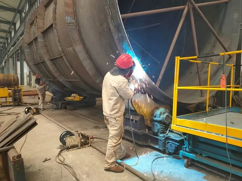 南通万达首台污泥干化机W型筒体材料为304不锈刚,焊接变形大,焊接时采用多种方法对筒体进行了固定,可是焊完筒体一侧后焊接变形依然非常明显。他紧急叫停焊接工作,冷静地分析原因,翻阅资料,最终将目光锁定在焊接顺序和方向上。他决定从焊缝尾部开始,用分段退焊、跳焊的方法,逐步向焊缝的头部方向焊接,最终使得筒体另一侧焊接变形量完全控制在误差范围内。