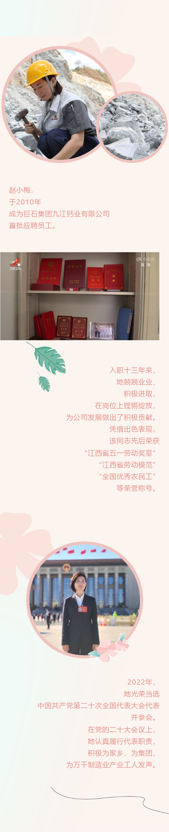 赵小梅,于2010年成为巨石集团九江钙业有限公司首批应聘员工。入职十三年来,她兢兢业业、持续进取,从农民工到公司技术骨干、从原料检测到管控立窑生产工艺、从普通职工到党的二十大代表,铿锵玫瑰璀璨绽放,在实现自身价值的同时,为集团公司的开展和家乡的经济建设贡献了自己的力量。