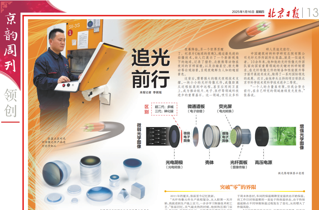 中国建筑材料科学研究总院有限公司光纤元件所副所长张磊,就是一位追光者。10余年来,他和他的团队面向国家重要领域的关键材料研制需求,在光纤传像元件的制备和性能提升等方面召开技术攻关,取得了一系列国际领先的新成果。由他牵头主持的项目荣获2023年度北京市科学技术奖科学技术进步二等奖。